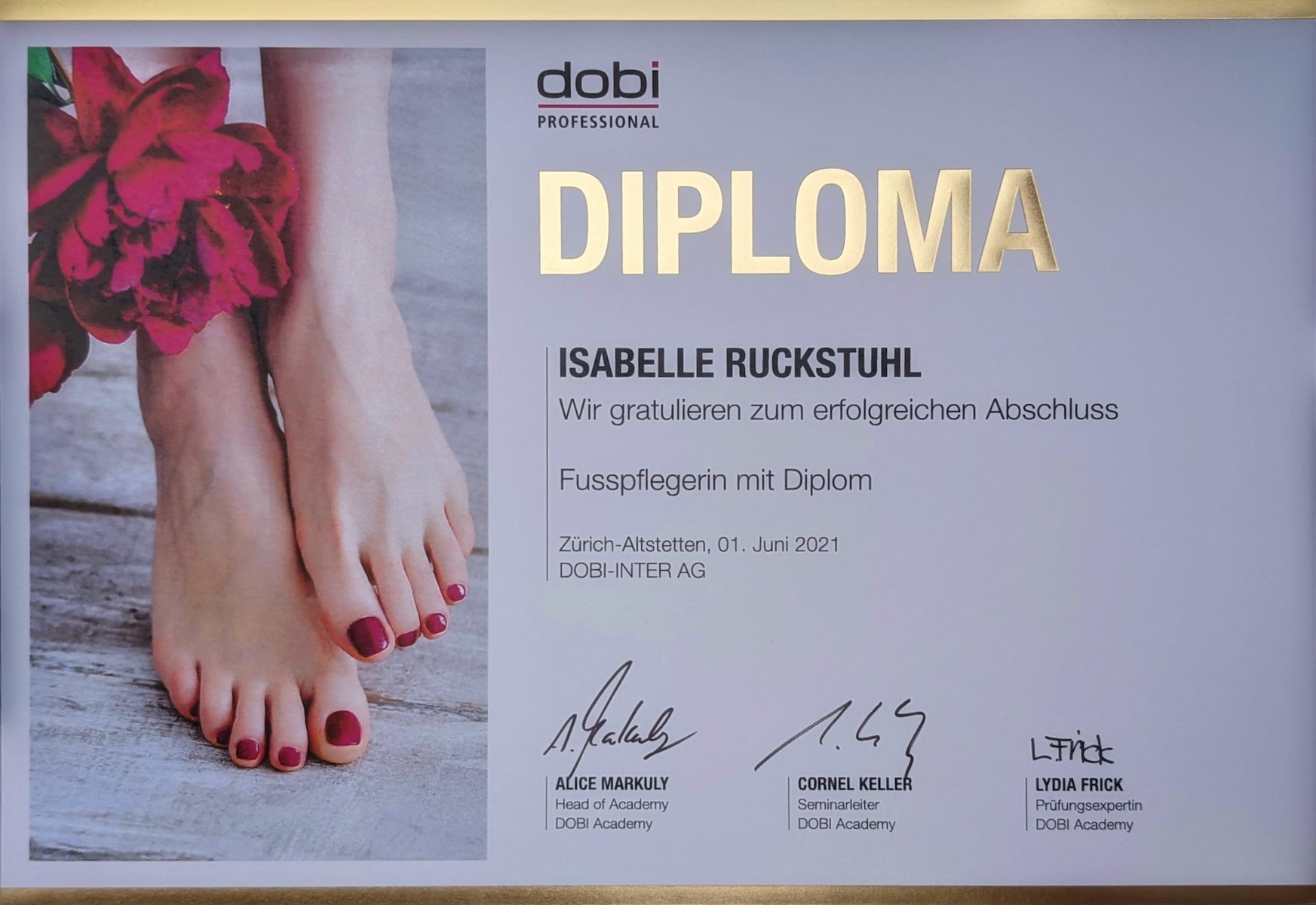 Im Juni 2021 habe ich den Abschluss zur diplomierten kosmetischen Fusspflegerin erworben. Das Interesse für das Thema begleitet mich im Hobbybereich aber schon länger. Mein beruflicher Hintergrund als kaufmännische & medizinische Assistentin in Arztpraxen, Spitälern u.a. gibt mir das nötige Fachwissen um die eigene kosmetische Fusspflegepraxis führen zu können. Der Kontakt mit Menschen macht mir grossen Spass und ich freue mich auf Ihre Anliegen und Wünsche einzugehen. Teilen Sie mir Ihr Behandlungsziel, Ihre Befürchtungen und Beschwerden mit, damit wir gemeinsam eine erfolgreiche Behandlung starten können.